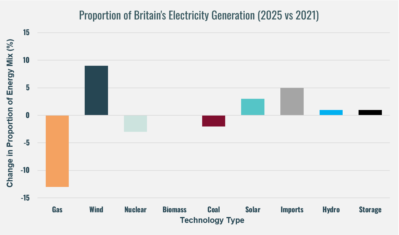 Figure 2: Change in proportion of Britain's electricity generation by energy source (2025 vs 2021). Data Source: NESO 2026.