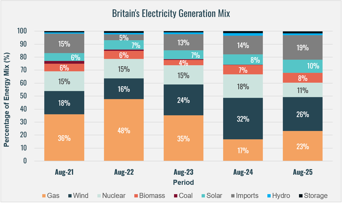 August 2025 saw wind retain its lead as the largest generation source, though its share dipped below 2024’s record levels. Gas rebounded from its unusually low contribution last year, while imports reached a five-year August high, highlighting ongoing vulnerabilities in energy security. Nuclear’s decline to its weakest August performance in five years further compounded these challenges.