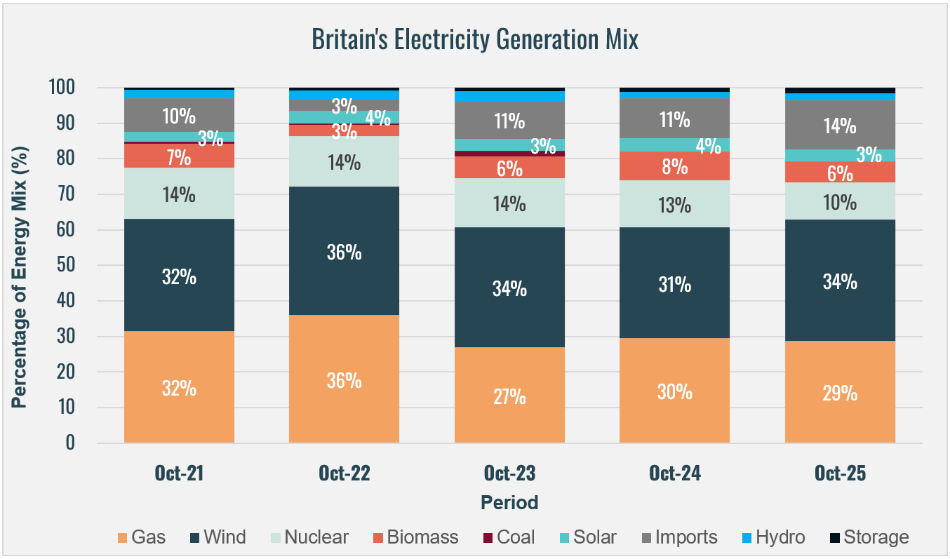 Electricity imports accounted for 14% of Britain's generation mix, up 3 percentage points compared to October 2024 and the highest October share in the past five years. This sustained level reflects continued dependence on cross-border electricity flows to balance domestic supply.